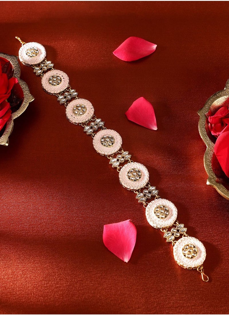 اخطفي الأنظار في كل مناسبة مع تاج Maang Tikka المتلألئ، مزين بأحجار الكندان البيضاء الساحرة. مصنوع من المعدن عالي الجودة مع طلاء ذهبي يضفي لمسة من الفخامة على طلتك. هذه القطعة المميزة هي إضافة مثالية لتعزيز جمال إطلالتك في الأعراس والاحتفالات الكبرى.