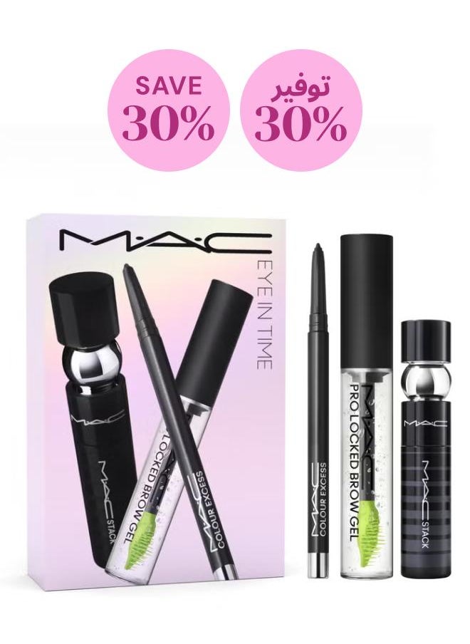 دللي عينيكِ مع طقم Eye In Time الذي يجمع بين التحديد الدقيق والرموش الجريئة. يحتوي هذا الطقم على مسكارا Macstack Mascara بلون أسود عميق، قلم جل Color Excess Gel Pencil، وجل الحاجب Pro Locked Brow Gel بتركيبة شفافة.
