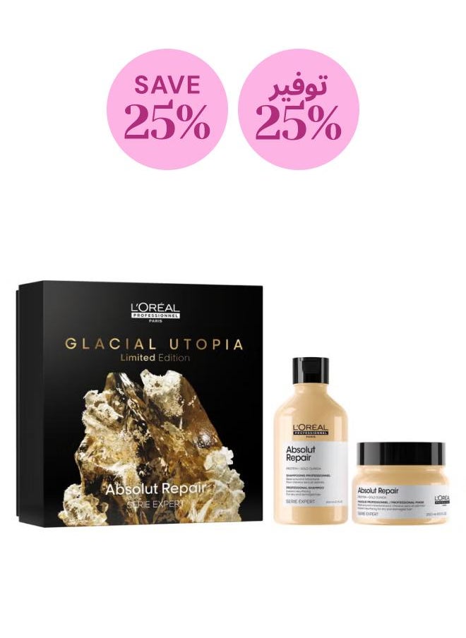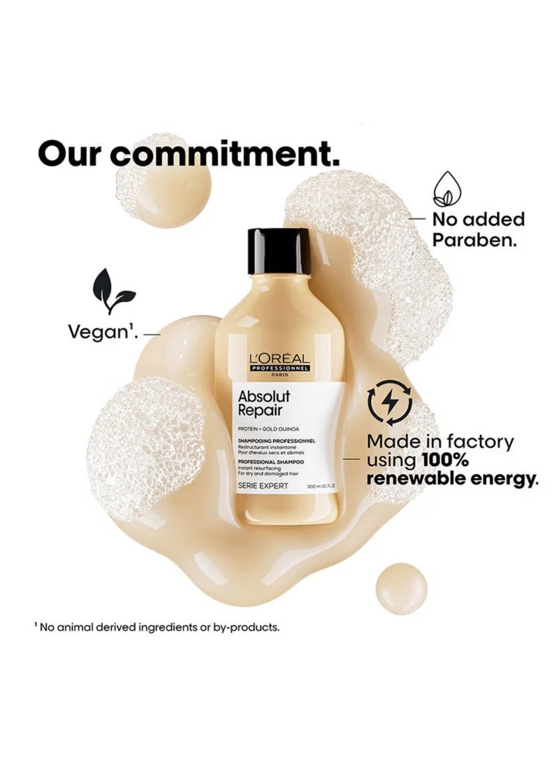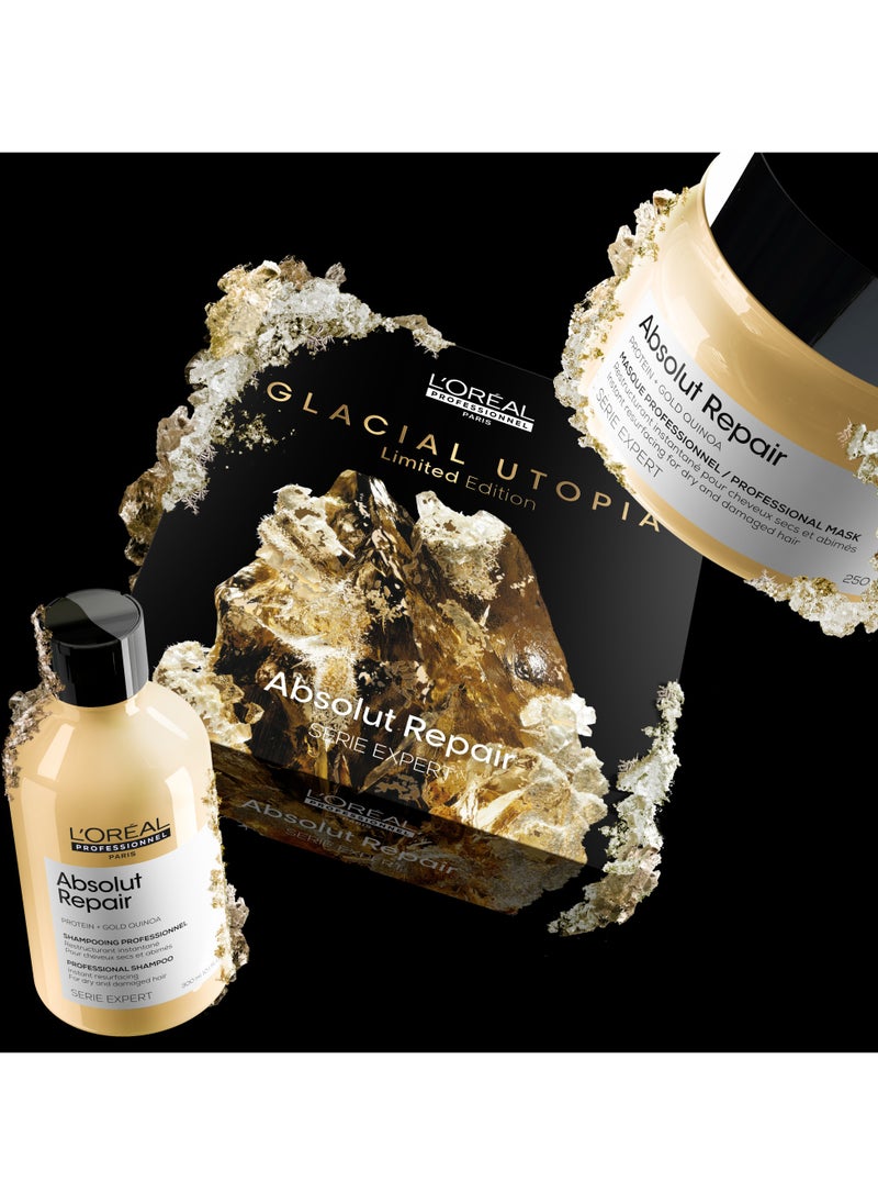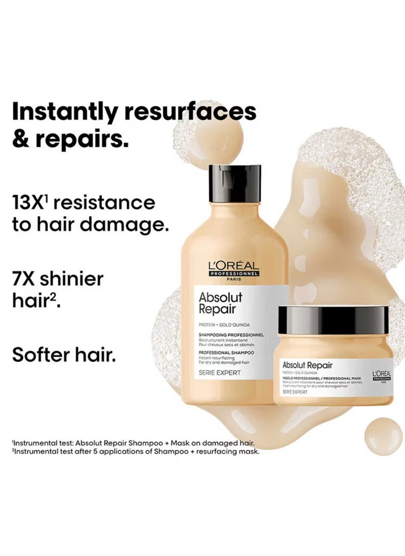 تمتعي بفخامة العناية بالشعر مع مجموعة أبسولوت ريبير من لوريال بروفيسيونال. هذه المجموعة، المعززة بمستخلص الكينوا الذهبية والبروتينات، تحول الشعر التالف والجاف إلى خصلات ناعمة يسهل تسريحها وتلمع برونق صحي. استخدمي الشامبو (300 مل) لتنظيف الشعر بعمق دون إزالة الزيوت الطبيعية، بينما يعمل الماسك (250 مل) على تغذية الشعر التالف وإصلاحه بفاعلية من جذوره حتى الأطراف. تقدم لكِ هذه المجموعة تجربة صالون منزلية فريدة، إذ تقلل الضرر بنسبة 77٪ وتزيد اللمعان بسبعة أضعاف بعد استخدام متكامل. تألقي بشعرٍ أقوى، أكثر صحة ولمعاناً مع كل استخدام!