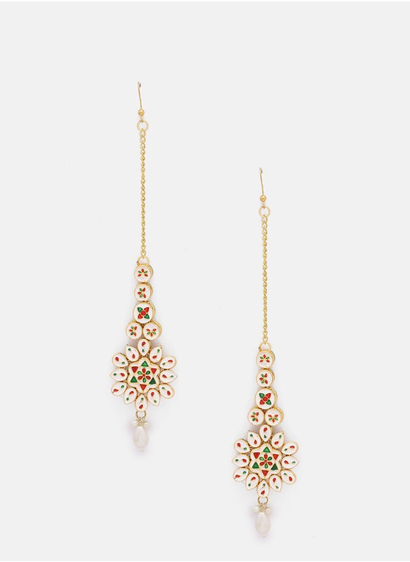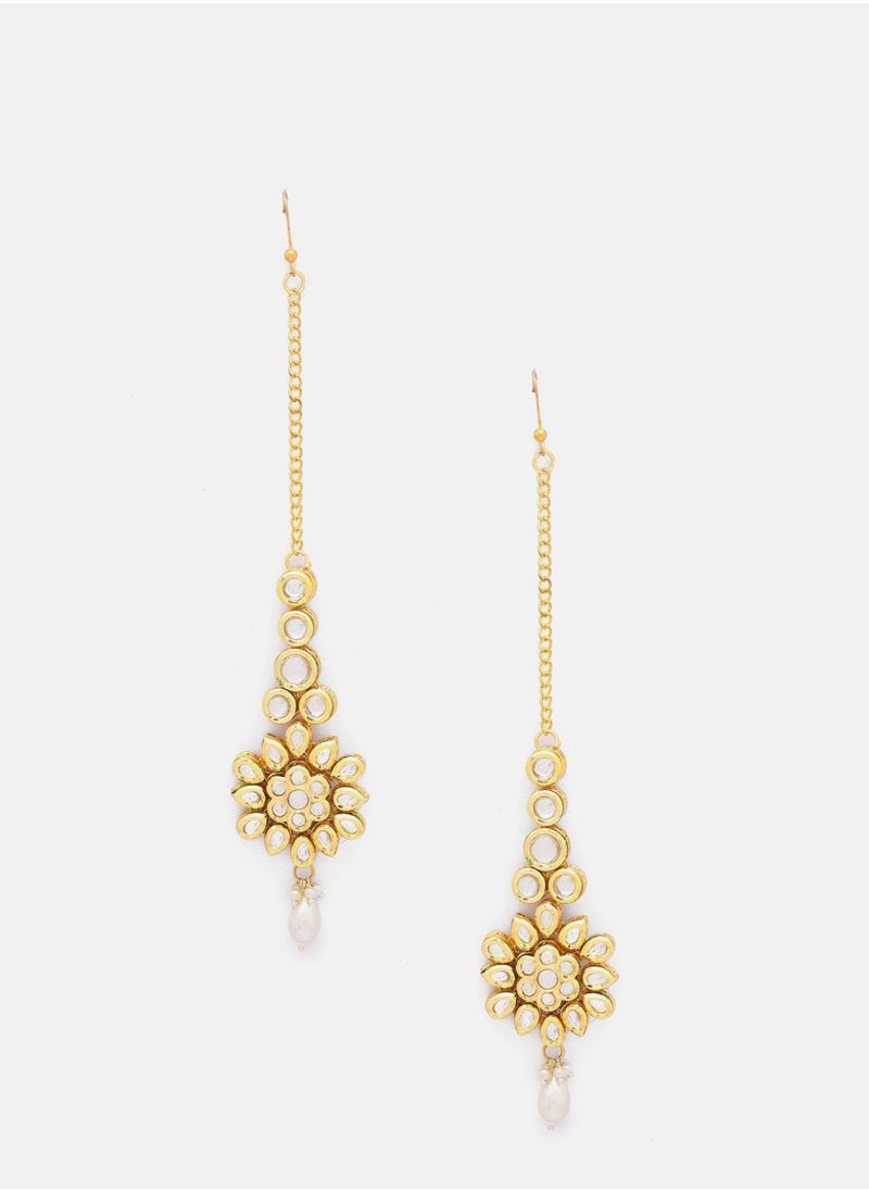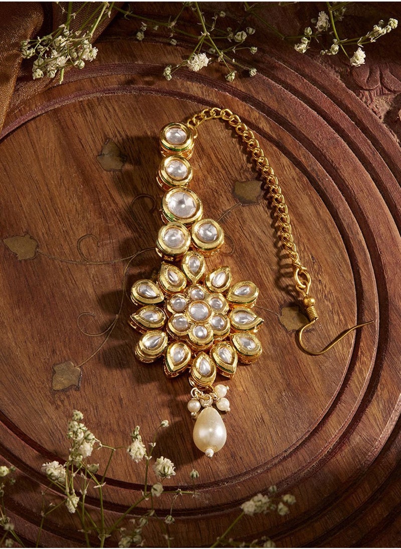 استمتعي بلمسة من الجمال الكلاسيكي مع تاج مانج تيكا المصمم بعناية فائقة لإضفاء رونق خاص بأسلوب يعكس التقاليد الغنية. يتميز هذا التاج باللون الذهبي الأنيق مع تفاصيل على شكل زهور مزينة بحبات اللؤلؤ وقطع الكندان البراقة، ليضفي رونقاً وبريقاً يأسر الأنظار. تأتي مع مشبك آمن يسهل تثبيته ويضمن الراحة طوال الوقت.