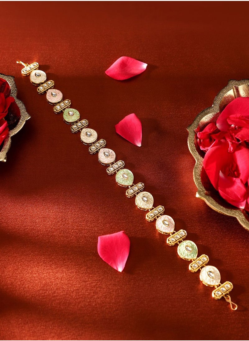 اكتشفي تاج مانغ تيكا، المصنوع من المعدن الذهبي بفصوص الكندان الأخضر، والذي يعزز أناقتك وجمالك في كل مناسبة. يلفت هذا التاج النظر بتصميمه الذهبي الراقي والحرفية الشاملة في التفاصيل، مما يجعله قطعة فاخرة لا غنى عنها لكل عاشقة للجمال والأناقة. بفضل تصميمه الفريد، فهو يضمن إضاءة حول الجبين ويعكس لمسة من الفخامة والتقاليد العريقة. استمتعي بتجربة تزيين منقطعة النظير مع هذا الإكسسوار الملفت الذي يسهل تنسيقه مع أبهى الأزياء. إضافة مثالية لطلتك في الاحتفالات والمناسبات الخاصة، يعد بأن يكون محور الإعجاب في كل تجمع.