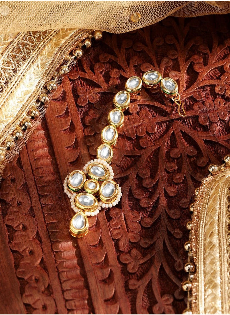 تعكس كل قطعة من تاج Kundan الذهبي مزيجاً مثالياً من التقاليد والأناقة. مصنوع من أفضل أنواع البراس ومطلي بالذهب الخالص، هذا التاج يتضمن تزيينات Kundan الفاخرة التي تلتقط الضوء بكل خطوة تخطوها.