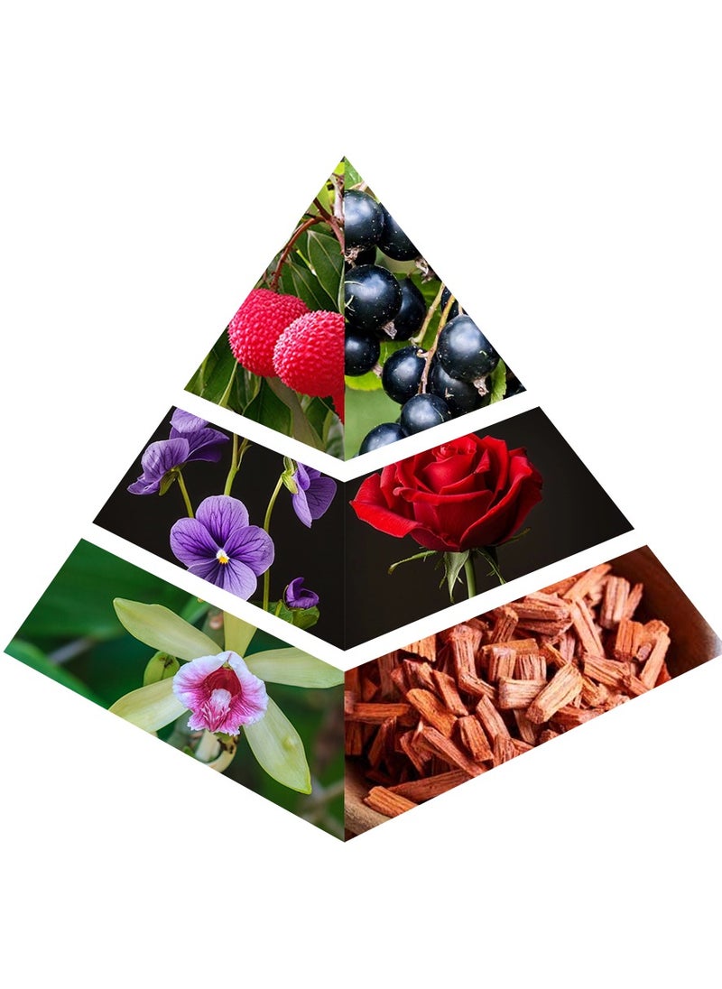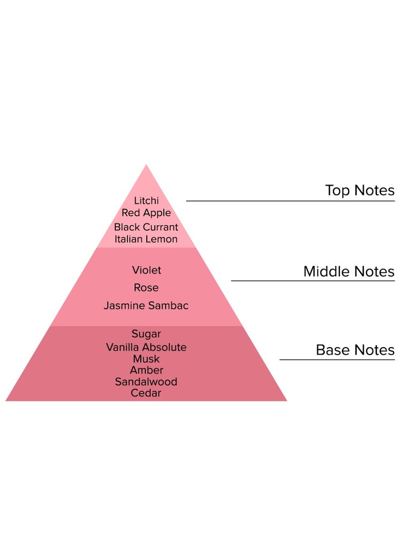 يبدأ هذا العطر رحلته بانفجار منعش من الليتشي النضر، التوت الأسود العصير، التفاح الأحمر الهش، والليمون الإيطالي الحاد، مانحًا مقدمة غنية ومتألقة. قلب العطر يتفتح بأناقة رائعة تجمع بين البنفسج، الورد، والياسمين السامباك، مما يضفي رقيًا فريدًا وحضورًا نسائيًا بارزًا.
