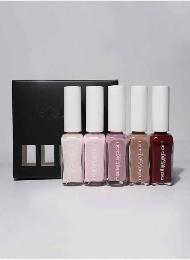 اكتشفي الأناقة والسحر مع مجموعتنا الفاخرة من 5 طلاء أظافر، المصممة خصيصاً لتمنحك إطلالة كلاسيكية لا تبطل. بتركيبتها المتقدمة، تقدم لك كل قارورة لمسة نهائية لامعة وطويلة الأمد تدوم لأسابيع، مما يجعلها الاختيار المثالي لكل يوم. الألوان الراقية والمتجانسة تمنحك تغطية متكاملة ومظهر أظافر فائق الجمال بكل سهولة.