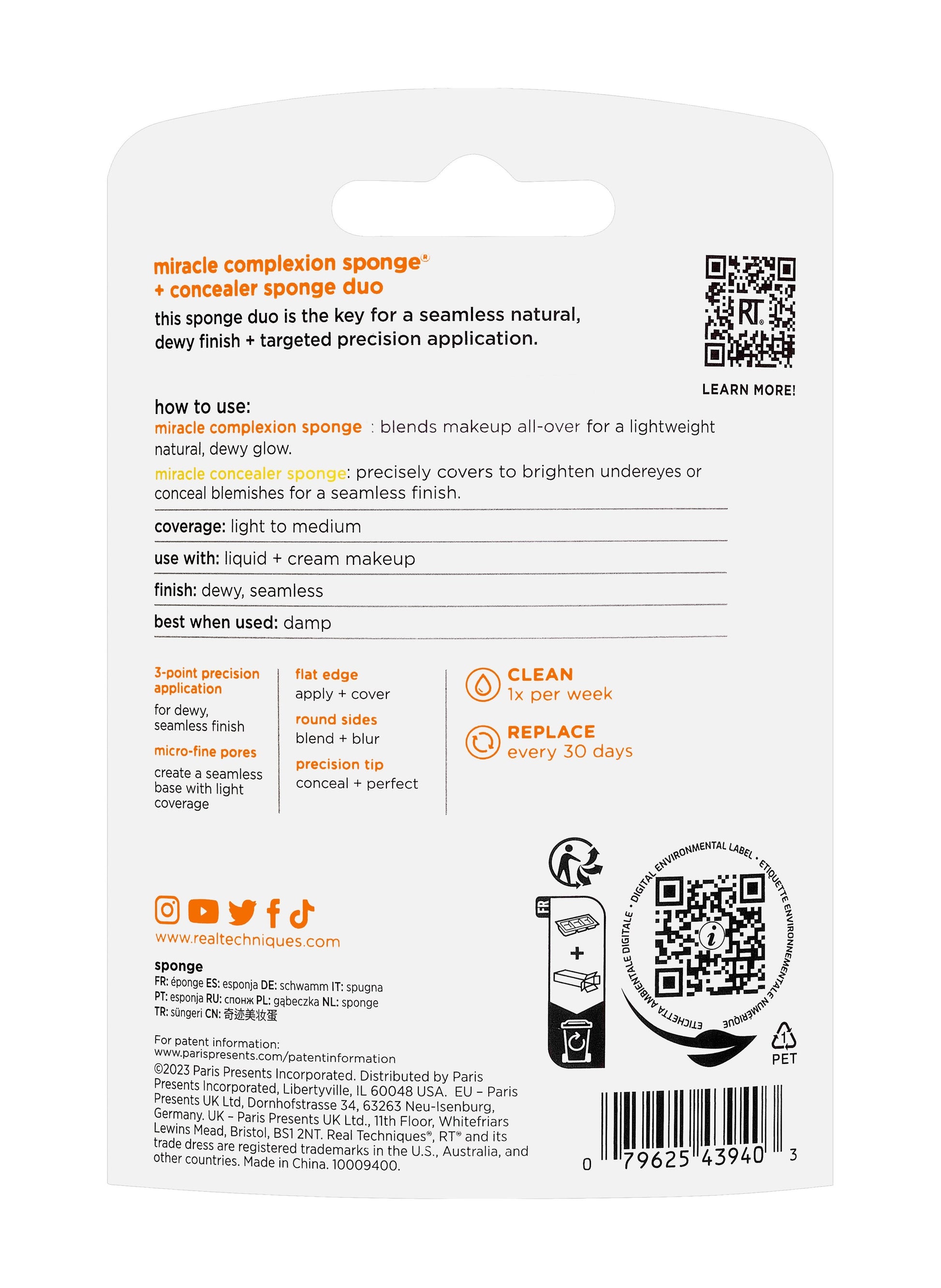 يتضمن مجموعتنا إسفنجتي Miracle Complexion وMiracle Concealer الجديدة. استخدمي إسفنجة Miracle Complexion لتطبيق قاعدتك بالكامل، وإسفنجة Miracle Concealer لتغطية العيوب وتحقيق تغطية دقيقة. تقدم إسفنجة Miracle Complexion أفضل أداء مع المنتجات السائلة والكريمية كأساسيات الوجه، بينما تم تصميم إسفنجة Miracle Concealer لتعزيز استخدام كريمات الكونسيلر. تمتاز كلتا الإسفنجتين بتقنية التطبيق الثلاثية النقاط من RT لدمج المنتجات بسلاسة تامة.