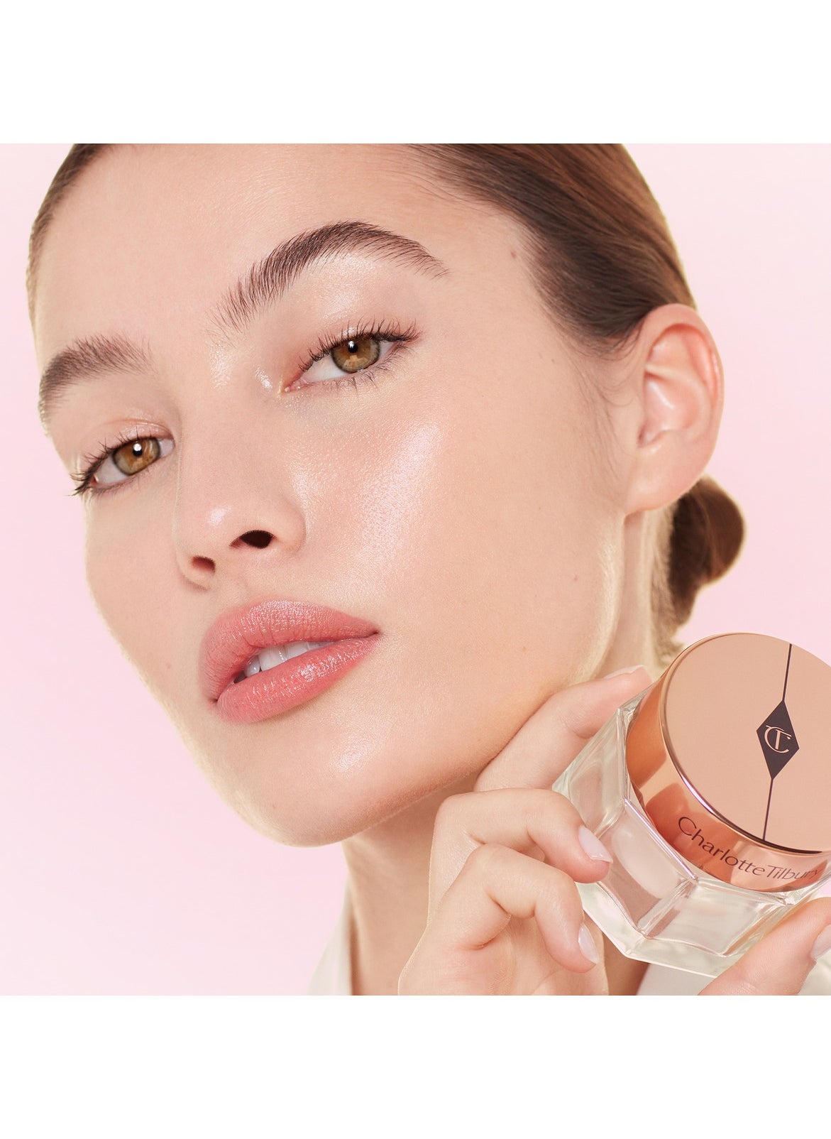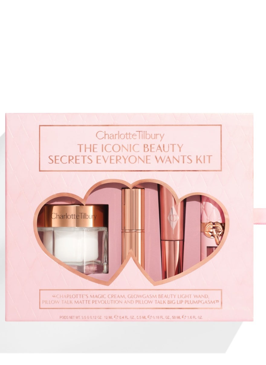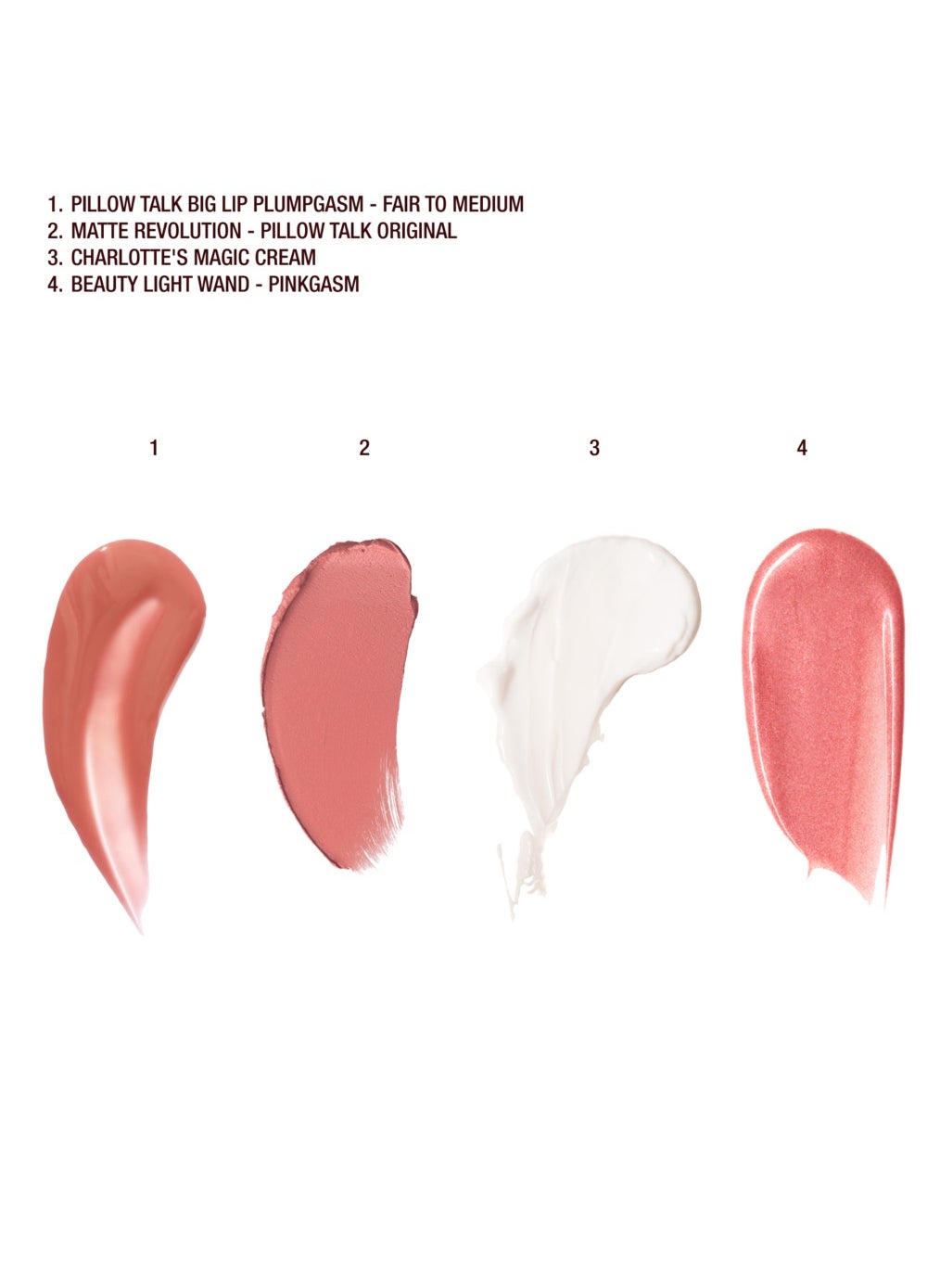 طريقة الاستخدام: أبدأي بتطبيق كريم Charlotte’s Magic Cream على البشرة ودلكيها جيداً. استخدمي أحمر الشفاه مباشرة من العبوة لدقة متناهية، وختمي بملمع Plumpgasm للحصول على شفاه ممتلئة. للخدين، ضعي Beauty Light Wand وامزجيه على العظام لمظهر مشرق وحيوي.