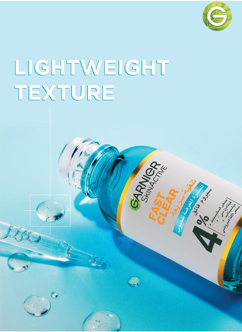 تمتعي بمظهر بشرة نقي وموحد مع سيروم فاست كلير من غارنييه. المركب الفعّال المحتوي على حمض الساليسيليك 4%، فيتامين سي، النياسيناميد وحمض الألفا هيدروكسي يعمل بقوة لتقليل الحبوب بنسبة تصل إلى 90% خلال 28 يومًا فقط.
