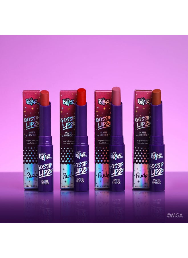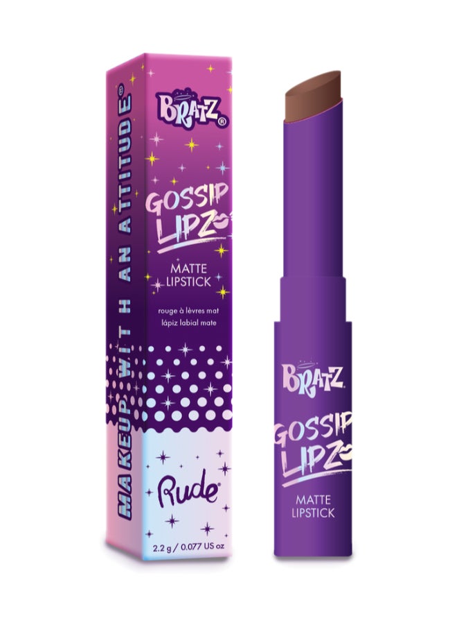 Unveil sumptuous, velvety lips with the Bratz Gossip Lipz Matte Lipstick in Bonita. Enriched with a lush, creamy formula, this lipstick effortlessly coats your lips, delivering a luxurious matte finish that feels as light as air. Dive into the rich, bold pigments that provide customizable coverage for looks ranging from subtle to intense, ensuring a stunning impact that lasts. Ideal for those who adore a hydrating touch with their matte look, making each application a nourishing experience.