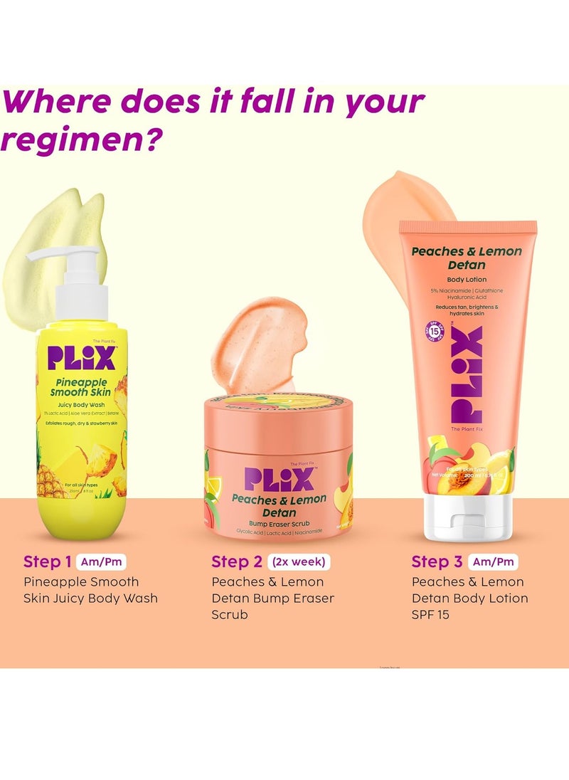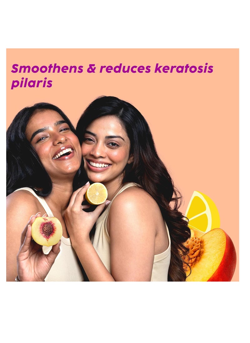 Redefine your skin's brilliance with PLIX Peaches & Lemon Detan Bump Eraser. Infused with the natural potency of peaches and lemon extract, this scrub is a powerhouse of Vitamin C, known to actively diminish pigmentation and even out skin tones. Revel in the experience of lighter, brighter, and visibly radiant skin with each use. Ideal for eradicating tan and dark spots, it also replenishes moisture, revealing a softer, smoother complexion. Perfect for routine skincare, ensure a rejuvenated glow with every application.