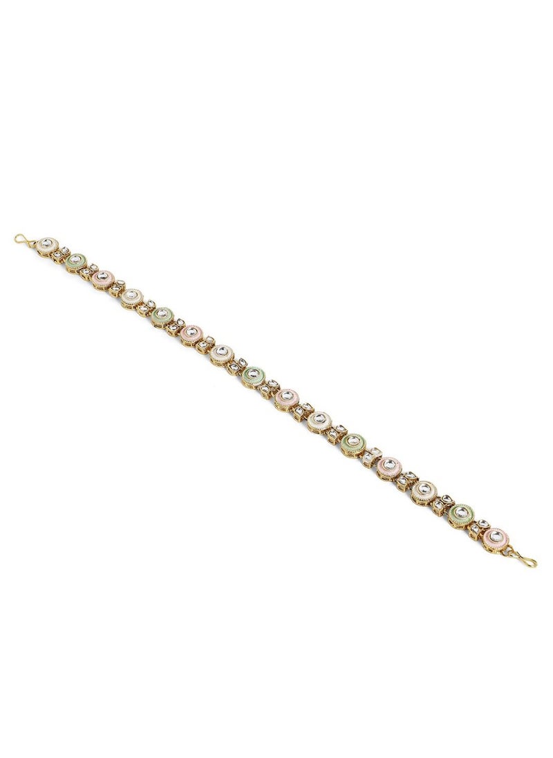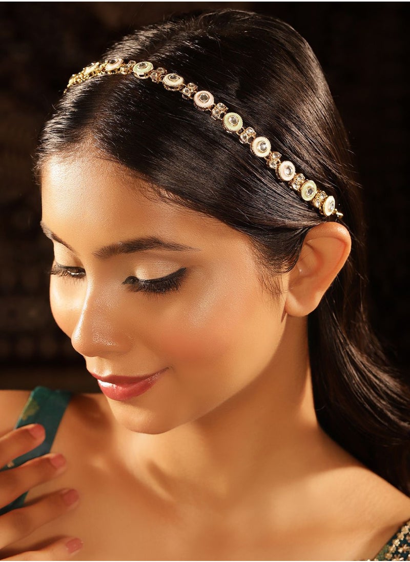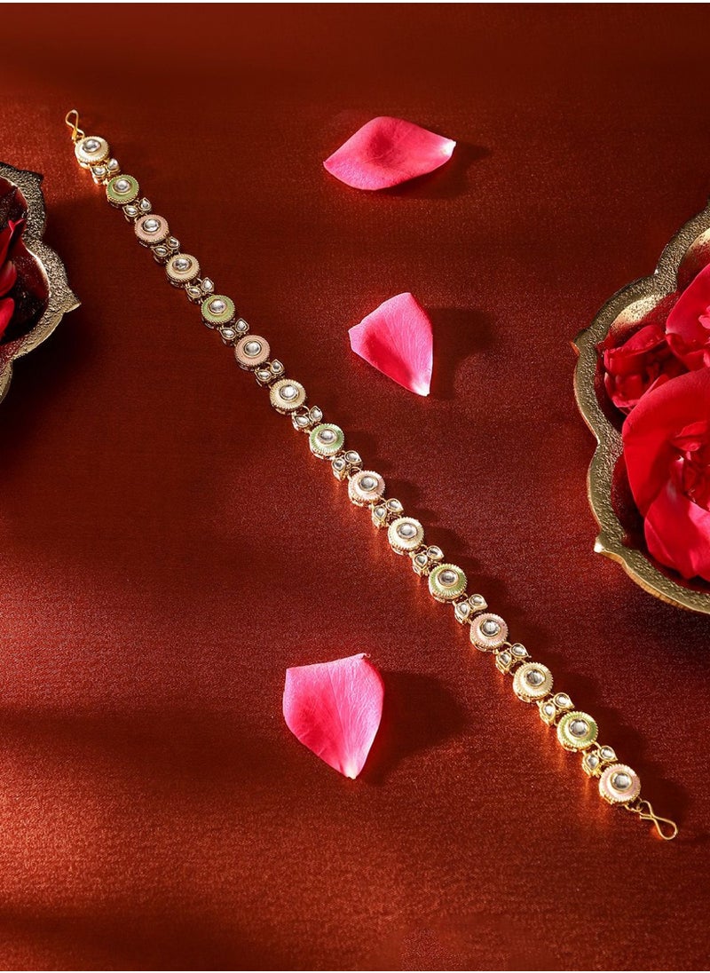 Elegance meets tradition in the Elegant Kundan Gold-Plated Head Chain Jewelry, a striking addition to formal and festive ensembles. Each piece is meticulously crafted with high-quality metal, adorned with pristine white Kundan stones that catch the light with every turn. The luxurious gold-tone finish complements a variety of outfits, making it a versatile choice for weddings, celebrations, and special occasions. This head chain not only enhances your beauty but also anchors your look with a touch of cultural heritage. Pair it with a traditional saree or a modern gown to elevate your style quotient.