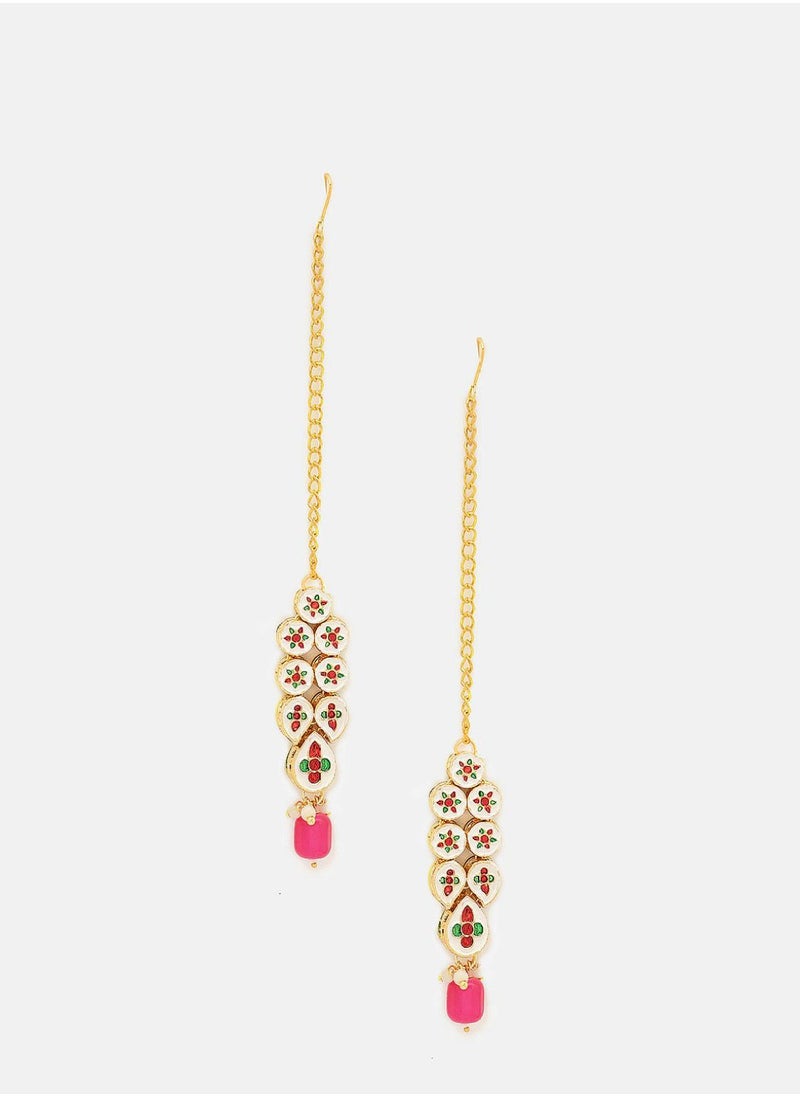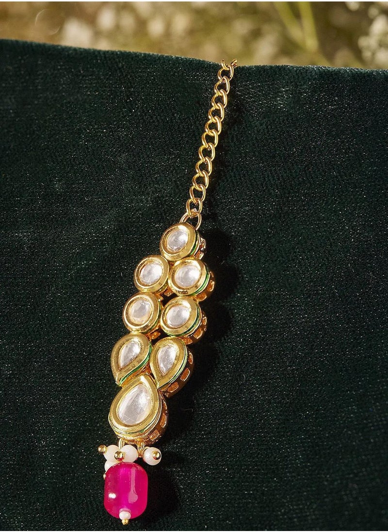 Elegance meets tradition in this meticulously crafted Kundan Studded Maang Tikka. The allure of this piece lies in its rich kundan stones, set within a polished brass framework and finished with opulent gold plating. Perfect for enhancing any festive attire, this maang tikka promises to be a captivating addition to your ensemble.