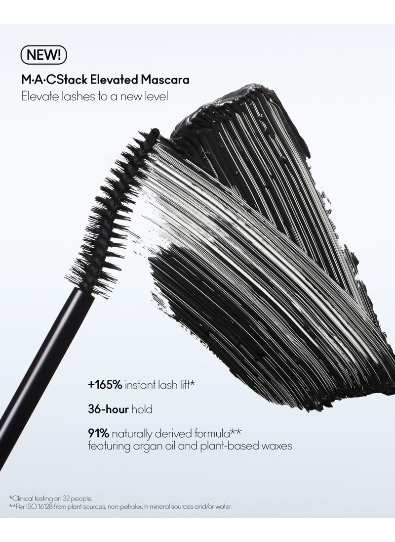 Unleash the true potential of your lashes with MACStack Elevated Mascara in Dramatic Black Lush. This revolutionary product promises a bold 165% instant lash boost, maintaining perfect curl and volume for up to 36 continuous hours. Dive into the luxury of wispy, well-defined lashes courtesy of our dual-sided, precision-tip curved brush that meticulously coats every lash without clumping. What's more, our 91% naturally derived formula enriched with nourishing argan oil ensures your lashes stay healthy and radiant. Achieve a flawless fan of lashes that beckons admiration with every blink. Ideal for those seeking to captivate with every glance, this mascara ensures your eyes remain the center of attention.