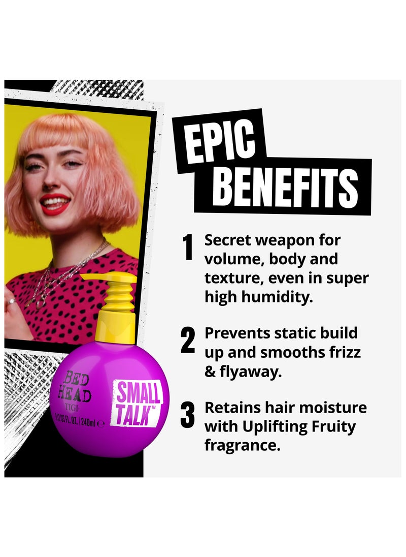 Transform your hair with Bed Head's Small Talk Hair Thickening Cream, a dual-pack miracle designed to volumize and thicken your tresses. This cream not only amplifies body but also infuses your hair with a noticeably thicker appearance, perfect for those with fine or limp strands. Powered by an advanced formula, it combats humidity, ensuring that your style doesn’t fall flat, no matter the weather. Enjoy the benefits of Pro Vitamin B5 as it locks in moisture, maintaining hair health and vibrancy. The cream's anti-static properties guarantee a sleek, smooth finish, reducing flyaways for flawless hair. Infused with a zestful fruity scent, Small Talk refreshes as it styles. Application is a breeze—simply work 1-3 pumps through damp hair, distribute evenly, and blow-dry to unlock peak volume. Indulge in the craft and creativity of Bed Head and let your hair do the talking!