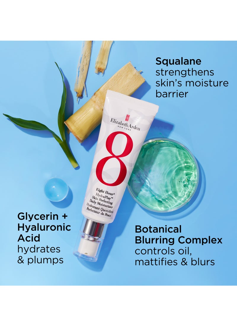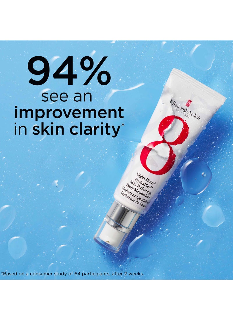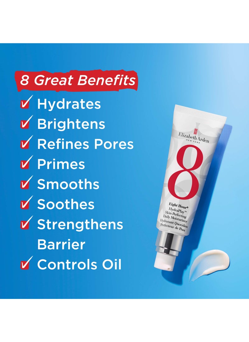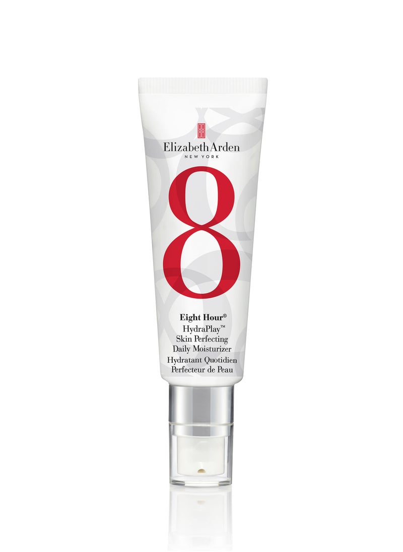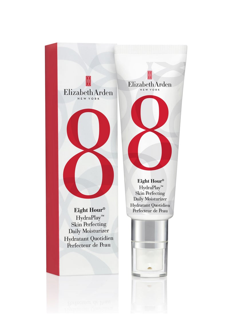 Delight in the elegance of renewed skin with the Eight Hour Hydraplay Skin Perfecting Daily Moisturizer. Born from the legacy of the iconic Eight Hour Cream, this advanced formula offers a multifaceted approach to achieving a flawless complexion. With its 8-in-1 action, it not only hydrates intensely but also brightens the skin tone, controls oil production, refines pores, and sets the stage for makeup application with its priming properties. The consensus is in—97% of users report noticeably smoother and brighter skin, while 94% experience enhanced clarity after just two weeks. Despite its powerful effects, the moisturizer remains lightweight and gentle on the skin, making it perfect for everyday use. Let your skin indulge in the luxurious care it deserves, every day.