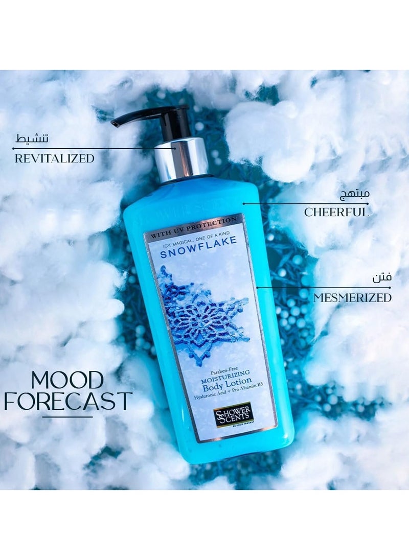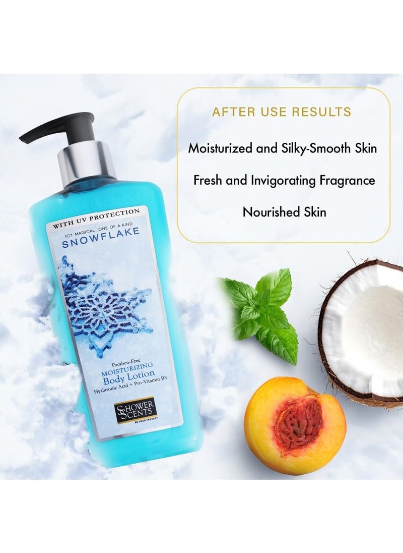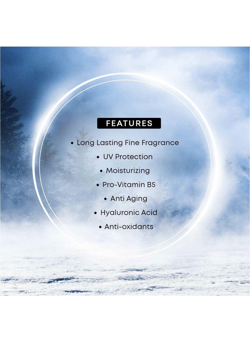 Luxuriate in the benefits of deep moisturization from Hyaluronic Acid, fortifying Provitamin B5, and nourishing antioxidants. The delicate, long-lasting fragrance ensures you carry the freshness and confidence of winter's purity throughout your day. Added UV protection and anti-aging properties shield and rejuvenate your skin, making every application a step towards youthful vitality.