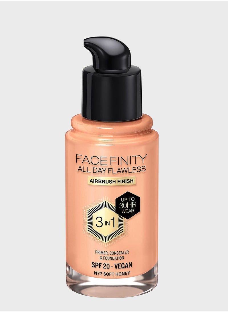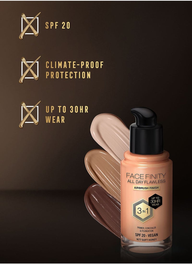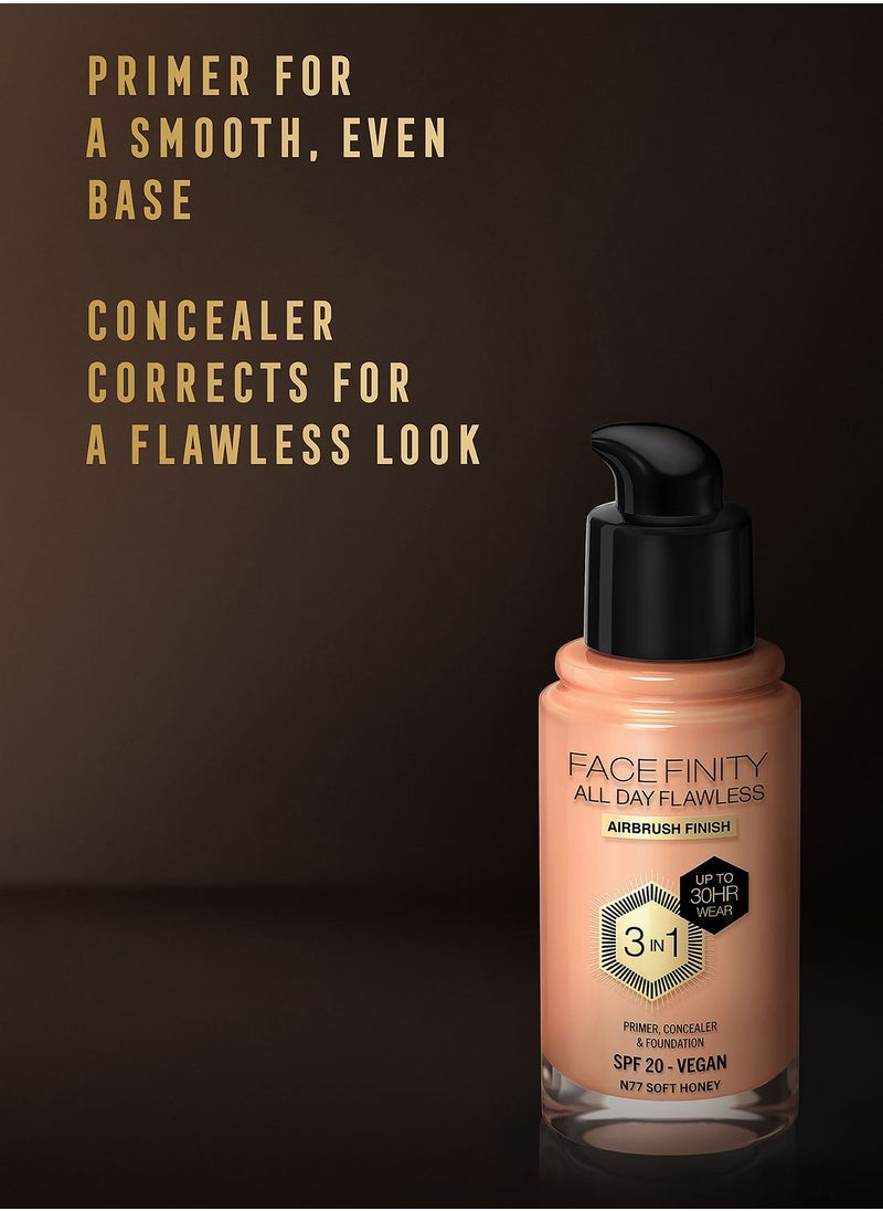 Unlock the secret to a pristine, long-wearing makeup base with Max Factor Facefinity Foundation in N77 Soft Honey. This premium 3-in-1 formula functions impressively as a foundation, primer, and concealer, ensuring up to a remarkable 30 hours of flawless wear. Created for those who demand perfection in every climate, this foundation boasts Climate Proof Protection - making it resistant to water, heat, and humidity while providing SPF20 to shield against harmful UV rays.