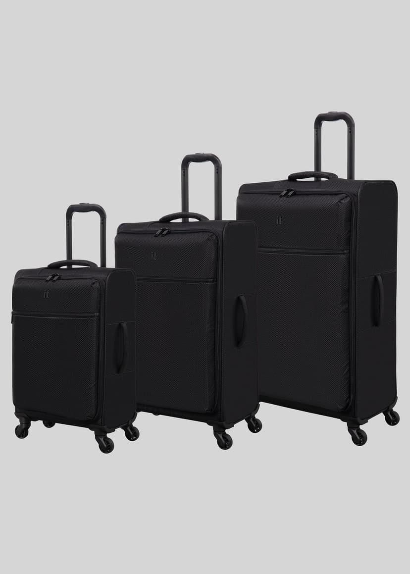 The elegance of travel is perfected with the Black IT Luggage Navigator Soft Suitcase, tailored for those who value a seamless journey. With its lightweight design, this suitcase glides alongside you, hardly noticeable but always reliable. Beyond its charming exterior, discover a constellation of features designed to simplify your travels.The robust wheel system of the Navigator goes beyond mere function; it is the product of ongoing design refinements and rigorous testing, ensuring industry-leading performance. Stability isn't just an option; it's built right in with a uniquely structured base that reinforces the suitcase's integrity. Navigate through crowded terminals or down cobblestone streets with the assurance of a sturdy trolley system that bears the weight of your world with grace.Handling your luggage is akin to a gentle handshake – smooth and untroubled, thanks to a comfortably padded top handle. Room is never an issue; expansive compartments accommodate both necessities and indulgences. Offered in three convenient sizes, each case provides tailored packing space to suit your journey's length and style, all secured with a 10-year warranty that promises enduring quality.